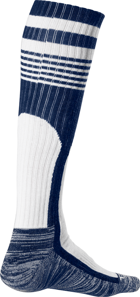 Atmungsaktive, knielange Throw Back Game Sock aus 93% Polyester, 6% Spandex und 1% Nylon. Farblich abgesetzte Fuß- und Archillespolsterung.