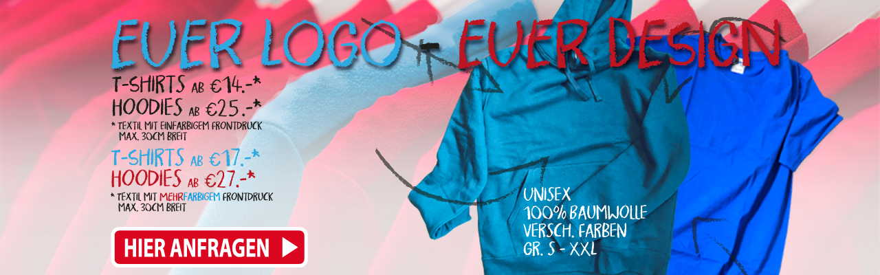 Wir bedrucken Shirts und Hoodies nach Euren Vorgaben mit Eurem Logo oder Design - ein- oder mehrfarbig.